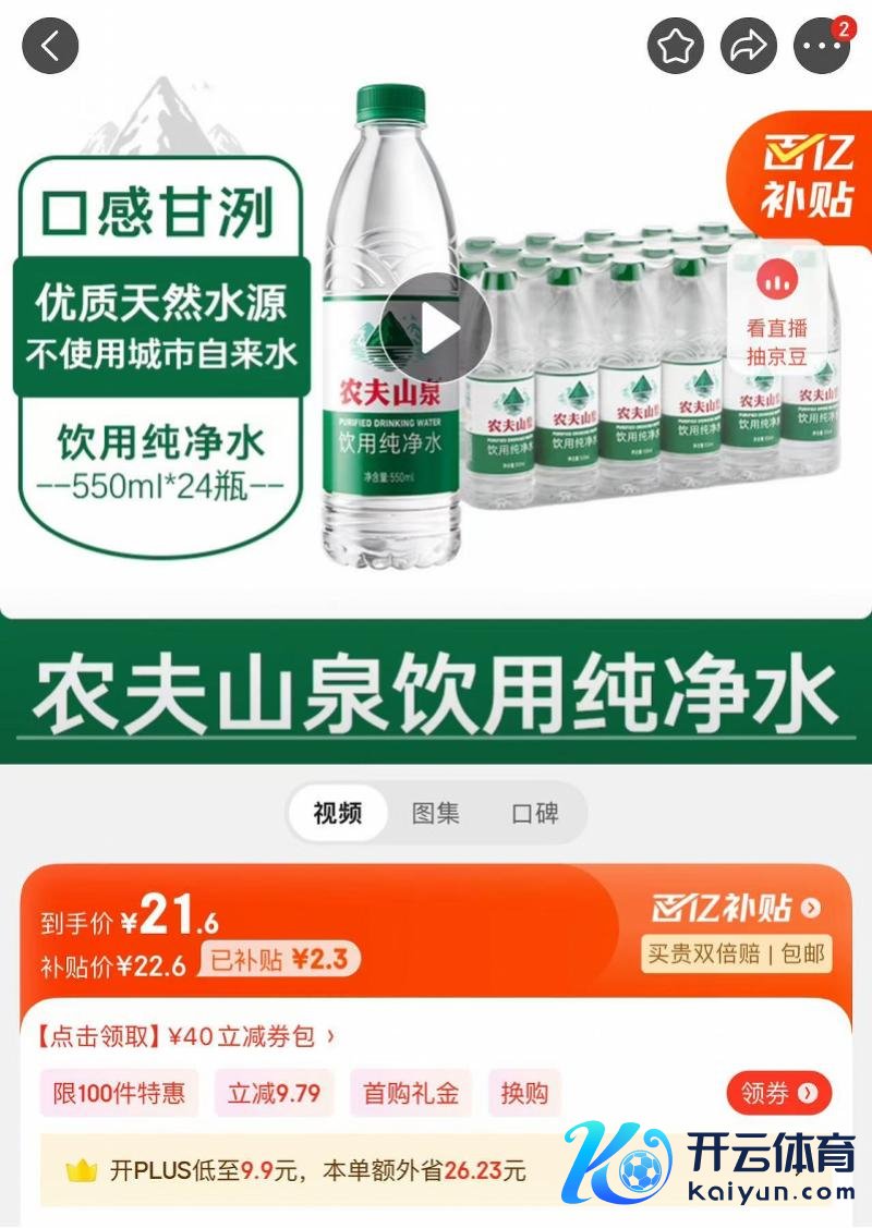 在农夫山泉某电商自营旗舰店,南齐湾财社记者看到,一件24瓶的绿瓶白清水售价为21.6元,每瓶价钱0.9元。该居品参与了平台的百亿补贴行动,平台补贴金额为2.3元。而一件24瓶的红瓶自然水售价为31.9元,每瓶价钱也仅为1.33元,且该居品并莫得参与百亿补贴行动。