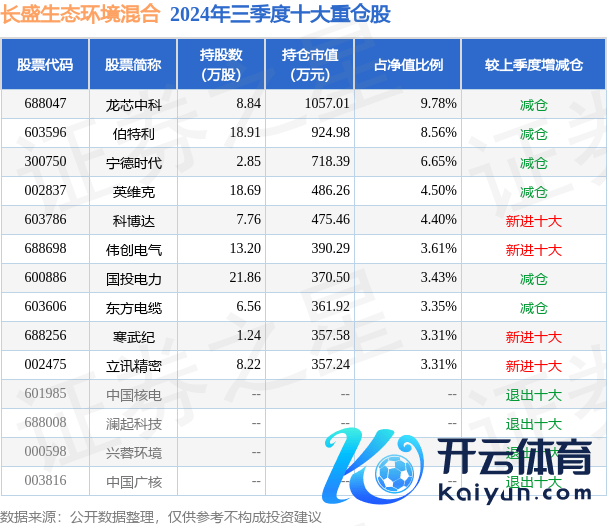 长盛生态环境羼杂为羼杂型-活泼基金,凭证最新一期基金季报显现,该基金金钱竖立:股票占净值比90.96%,无债券类金钱,现款占净值比9.26%。基金十大重仓股如下:
