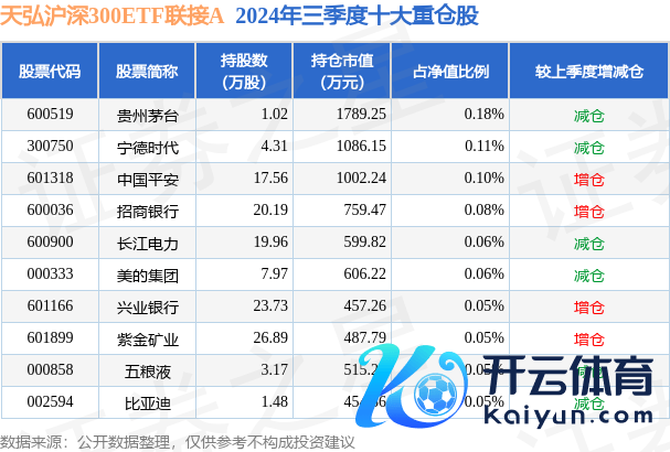 天弘沪深300ETF衔接A为指数型-股票基金,阐明最新一期基金季报深远,该基金财富建立:股票占净值比3.44%,债券占净值比0.19%,现款占净值比5.08%。基金十大重仓股如下: