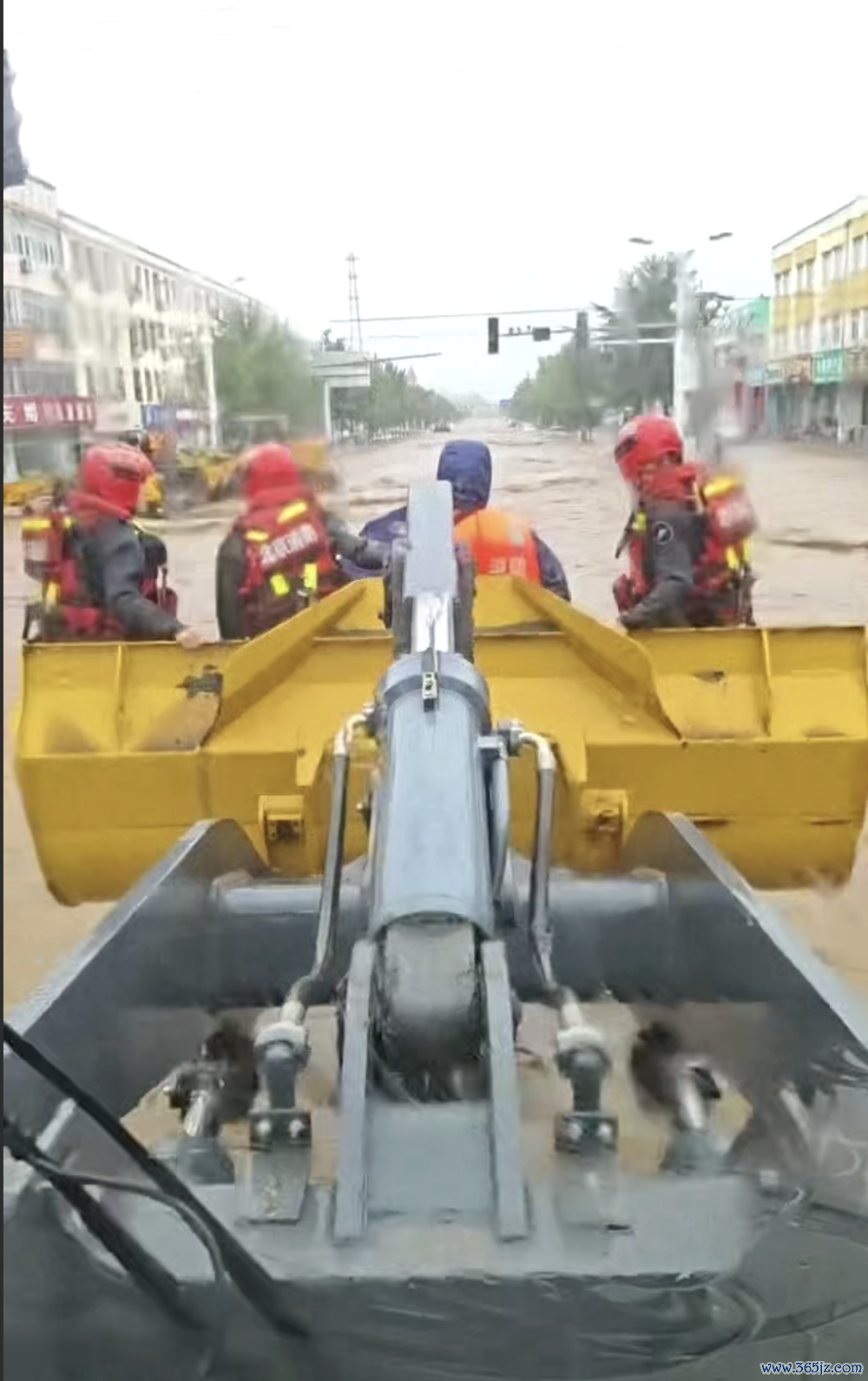 图为王天宇的铲车在激流中运载挽救队员。(受访者供图)